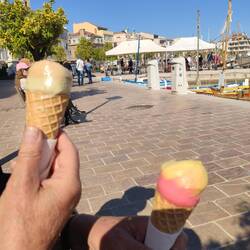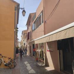 La moto nous amène au centre de Sanary. Une large zone piétonnière invite à la flânerie entre les boutiques de tout genre. L'office de tourisme nous fournit les plans utiles. Après la visite deLæs mere