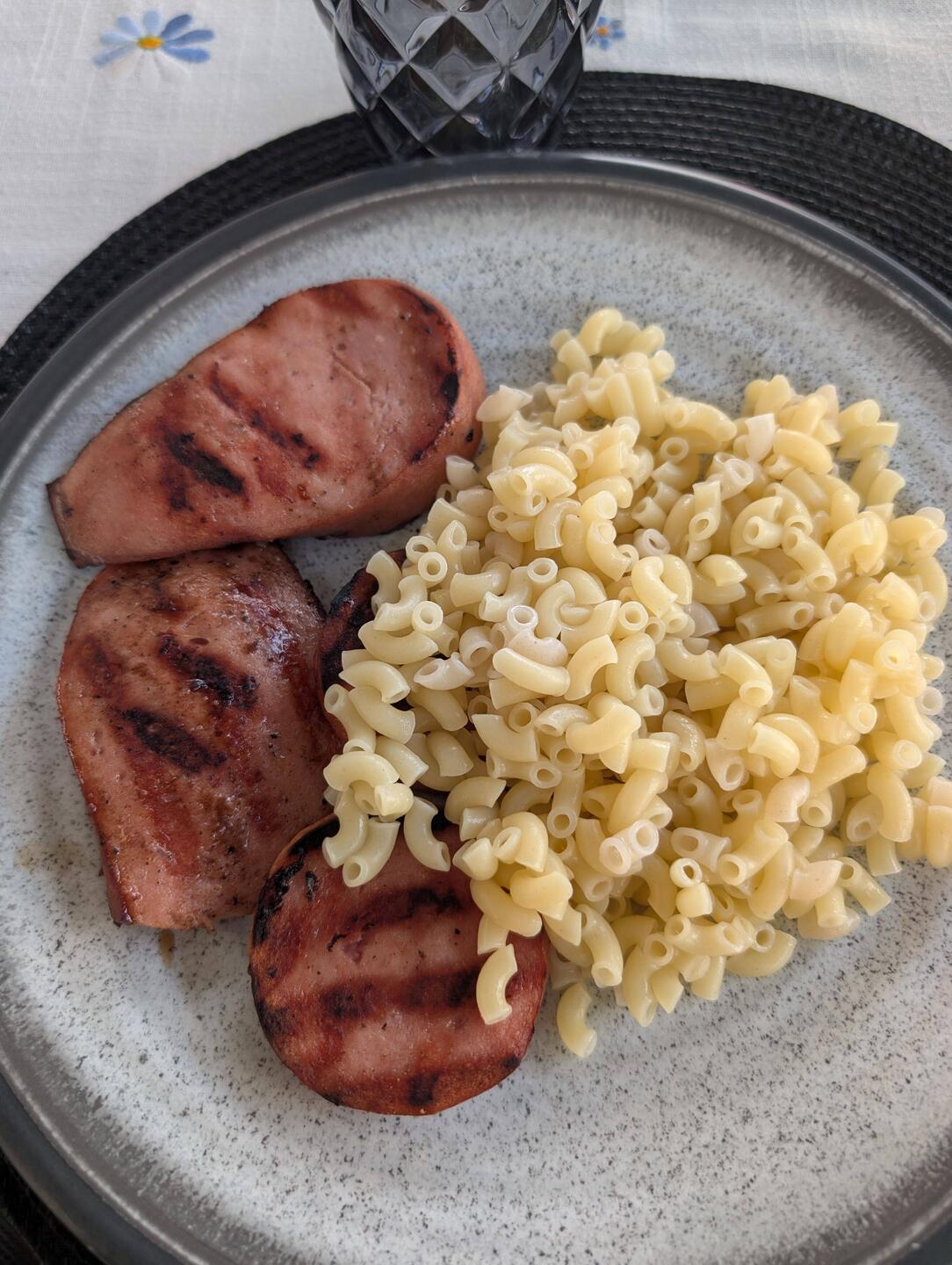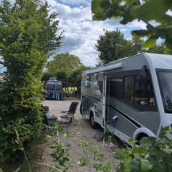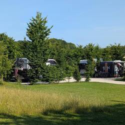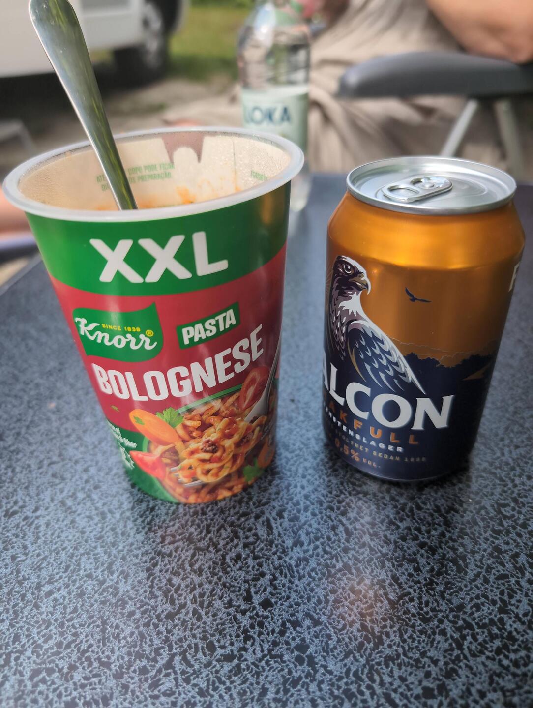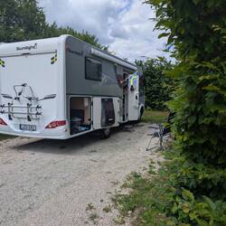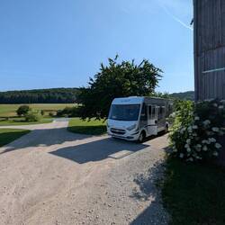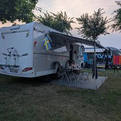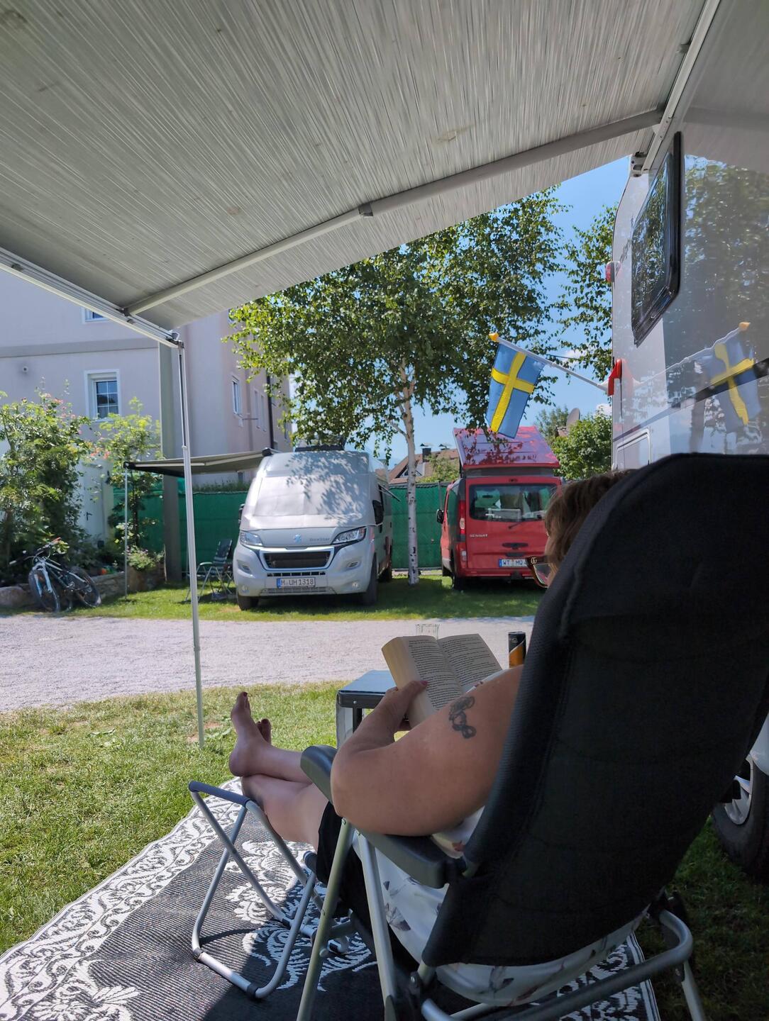Beslutade att 60 mil fick räcka för i dag. Från autobahn rakt ut i skogen. En liten ställplats med åtta platser. Maggan har redan fixat mat så det är dags att äta!