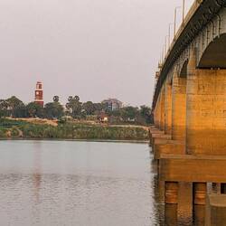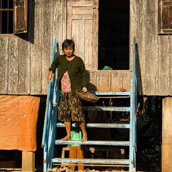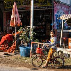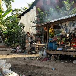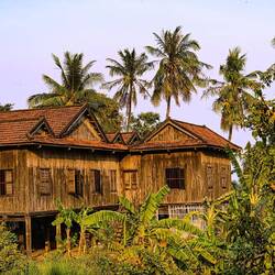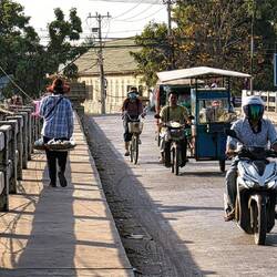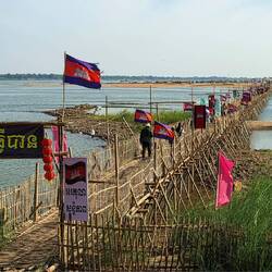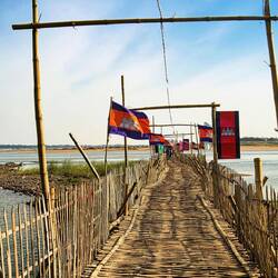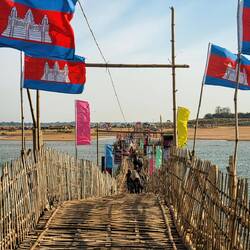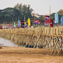 Kleine Stadt am Mekong, Einfluss der französische koloniale Zeiten, bekannt für die längste Bambus Brücke der Welt mit 940 m ....