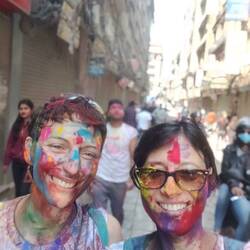C'est parti pour Holi ! On se fait rapidement agresser à coup de ballons d'eau et de couleurs, mais nous pouvons heureusement répliquer. Ça danse sur de la techno autour de Durbar square, la majestueuse place classée a l'Unesco où se trouvent de nombreux temples et vieux palais, ainsi que dans tous les coins de rues.