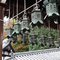 Le musée de Nara est petit mais doté de trésors d'une telle beauté, essentiellement des statues de Bouddhas et de sages, qu'il impose aux visiteurs un silence respectueux. Quel contraste par rapport à l'extérieur, où des touristes naïfs se font assailllir par les daims gourmands à qui ils ont donné des gâteaux ! Nous déambulons donc dans les allées remplies de daims et de touristes, visitant d'autres temples au passage. Un peu excentré, le Kasuga taisha se distingue par sa couleur orange et par ses allées bordées de lanternes moussues, au milieu de la forêt.