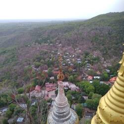 Depuis Bagan, apres avoir visité quelques derniers temples, je file vers le mont Popa, une cinquantaine de km à l'est. Ca monte mais ce nest pas si terrible et je suis ravie de me dire que chaque centaine de mètres pris en hauteur signifiera peut être un degré de moins?