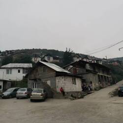 Wir stehen mitten in einem malerischen alten Dorf. Ganz typische Holzhäuser. Das Holz ist in Streifen dunkelbraun - weiß gestrichen.