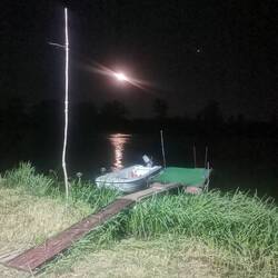 Der Mond leuchte auf, spiegelt sich im Fluss, die Sillouetten und Schatten der Bäume sind erkennbar, Tiere machen Geräusche, es ist Sternenklar.