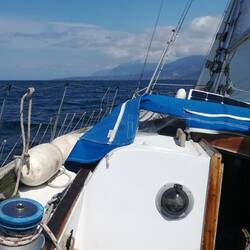 Um 9 Uhr kamen wirklich alle Fischerboote in den Hafen. Eines hatte gar nichts, mein junger Fischer Einiges gefangen. Die Fische steckten noch im Netz und er pulte sie da raus. Das dauerte, aber ich bekam einen relativ großen Fisch für 5€, packte ihn in eine Plastiktüte und wickelte ein feuchtes Tuch rum, um ihn kühl zu halten. Gegen 10:30 Uhr kam ich dann los und segelte recht flott nach Nordosten. Der Westwind schob ordentlich. Draußen kamen ziemlich große Wellen aus Süden und dann auch noch aus Westen. Der Wind ließ nach und die Segel schlugen. Also Motor an und Segel runter. Plötzlich ein metallisch, laut schepperndes Geräusch. Ein-zwei Sekunden dauerte es, bis ich begriff, dass es kein Motorschaden war. Der Anker war ausgerauscht. Mist, da hab ich einmal vergessen, ihn zu verriegeln und dann Das! Ich schaltete den Motor in Leerlauf und ging zum Bug, um zu sehen, ob Anker und Kette noch da wären. Zum Glück hatte der Ankerkastendeckel das Ausrauschen der kompletten Ankerleine verhindert. Die große Öse der Leine war hängengeblieben. Uff!