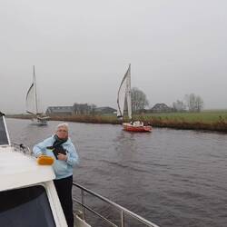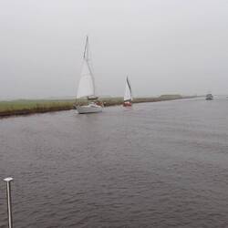 Zwei tapfere Segler kamen uns mit achterlichem Wind entgegen, als wir auf dem Sneeker Meer nach Heeg abbogen. Hut ab!