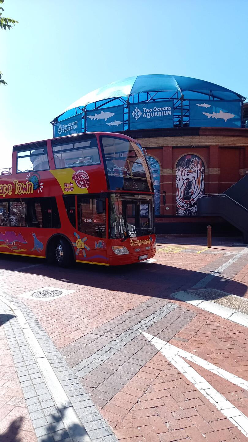 Da laut Website der Tafelberg heute früh wegen zuviel Wind nicht mit der Seilbahn angefahren wird, entschieden wir uns, eine Hopp on/Hopp off Tour zu machen. Am Aquarium ging es los.