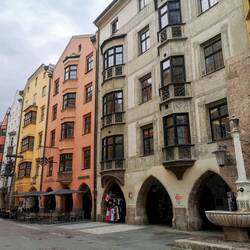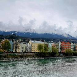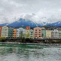 Innsbruck is famous for its colourful historic buildings along the river, in front of a mountain backdrop.