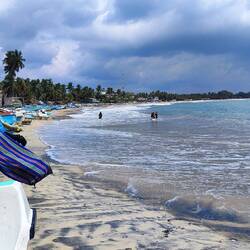 Aún es pronto, asi que dejamos las mochilas, saludamos a nuestros anfitriones de hoy (Aileen, una mujer belga que se ha casado con un Sri Lankés, y un chico super majo y sonriente que trabaja para ellos nos dan la bienvenida) y nos damos una ducha rápida antes de caminar por la playa a ver el pueblo y las distintas casetas y restaurantes que hay. Nos damos nuestro primer baño del viaje, y el agua sabe a gloria. Está a 28° y más salada de lo normal. Jugueteamos con las olas mientras el dia va llegando a su fin.