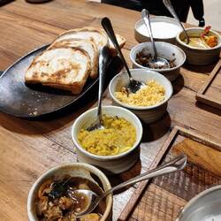 Después de recorrer todas las salas, acabamos por comprar un par de piezas y nos disponemos a cenar. El "menú del día" de hoy es Paan a la brasa (parecido al pan de molde pero más grueso y grande), acompañado de curry de gambas (para Iciar) o cerdo (yo), sambol de coco y moju de berenjena (parecido al que hicimos en Ella). La comida está buenísima, e Isank viene de vez en cuando a preguntarnos si todo está bien y necesitamos alguna cosa. Nos pregunta sobre nuesto país y dice que Barcelona le gusta (aunque no haya estado) porque el urbanismo le parece muy ordenado. También nos cuenta que los coches en Sri Lanka son muy caros, llegando algunos modelos de segunda mano de 2016 a los 24.000€, cuando nuevos en europa costarían 20.000€. Resulta que él es de Nuwara Eliya, y le hace ilusión saber que nos gustó mucho su pueblo y que solo 6 días antes estábamos tomando una cerveza en "The Pub", bar al que siempre va cuando está por allí.