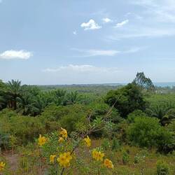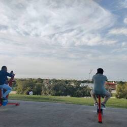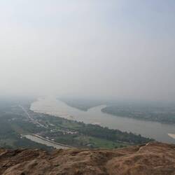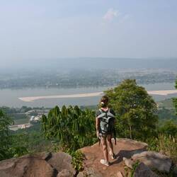 Den Drahtesel von gestern tauschten wir heute gegen einen grösseren und schnelleren ein: ein pinker Barbie-Roller.😂 Mit dem automatisierten Untersatz machten wir uns als Erstes wieder auf die Suche nach etwas Frühstücktauglichem. Aber auch mit vergrössertem Radius und ohne Songkran, gestaltete es sich nicht so einfach und so landeten wir erneut im Foodcourt eines riesigen Einkaufszentrum. Wo Tamara fast infolge der Schärfe ihres Papayasalats starb und Sven verzweifelt eine blutfreie Suppe suchte. Als wir uns von diesem interessanten Frühstück erholt hatten, nahm das hin und her pendeln zwischen Zug- und Busstation einmal mehr seinen Lauf und bis wir schlussendlich Zugtickets der dritten Klasse für den morgigen Tag in den Händen hielten. Die Transportsorgen losgeworden, düsten wir entlang des Mekongs zu einem Aussichtspunkt bei einem Tempel. Obwohl die Anfahrt dorthin landschaftlich sehr reizvoll und wir immer wieder erfreut von Einheimischen gegrüsst wurden, gestaltete sich die lange Fahrt auf dem Roller recht zäh und wir mussten für unsere schmerzenden Popos eine Kaffeepause einräumen. Obwohl das Café den vielversprechenden Namen "Sea Otter View" trug, sahen wir dort leider keine Otter.😔 Beim Viewpoint angekommen genossen wir die schöne Aussicht auf den Mekong. Bis der Rauch sich verdichtete und wir einen Abstecher weg vom Rauch und dem Mekong etwas ins Landesinnnere aufs Land machten. Und hier sahen wir das Thurgau Thailands den Isaan endlich so wie wir uns diese Region vorgestellt hatten: Reis-, Getreide- und Gemüsefelder soweit das Auge reicht, Bauern die mit alten Pflügen und typischen Hüten das Land bestellen, Vieh und kleine Dörfer. Funfact von heute: auf dem Land bestehen die Müllcontainer aus überdimensionalen Miraculix Zaubertöpfen.^^