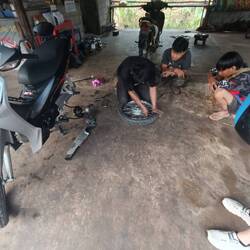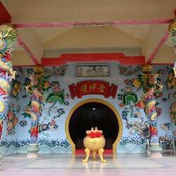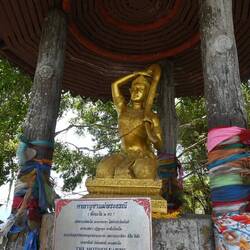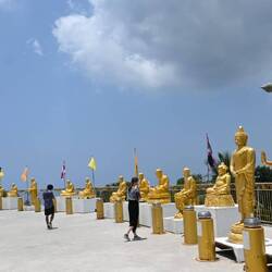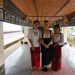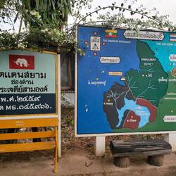 Die legendäre Almosenverteilung an die Mönche (DAS Must-Do in Sangkhlaburi) hatten wir verschlafen, für das traditionelle Frühstück danach, Jok, reichte es aber gerade noch. Insbesondere mit dem Roller, welchen wir direkt von unserem Gastgeber mieten konnten. Helme seien leider zu teuer, meinte er auf gestisch und einem entschuldigendem Lächeln und auch der Tank gab nicht mehr wirklich was her. Also hiess es zuerst noch schnell einen Stand mit abgefüllten Schnapsflaschen voll Benzin suchen und ein Rollervermieter mit Helmen, da es uns ohne Kopfschutz schon ein bisschen zu riskant war in Thailands Verkehr. Schlussendlich fanden wir alles am Dreh- und Angelpunkt dieser Stadt, der Busstation und konnten sogar gleich noch unsere Tickets für die Weiterfahrt kaufen. Dann ging es endlich zum Jok essen. Leider schloss unser favorisiertes Frühstückslokal gerade als wir ankamen. Glücklicherweise gab es aber etliche Restaurants zum Ausweichen und so fanden wir uns nur wenige Sekunden später vor zwei dampfenden Schüsseln Jok wieder. Wahnsinnig lecker sieht der Reisbrei ehrlicherweise nicht aus, aber man kann ihn gut unter all den bereitgestellten Toppings (Frühlingszwiebel, knusprigen Nudeln, Bambussprossen, sonstigem Kraut sogar fermentiert, Ei und Hackfleisch) verstecken. Fazit: mit Maggi und Chilli ergänzt, kann man das schon einmal als Frühstück machen. Tamara hätte ihn lieber mit Früchten gehabt.😉 Anschliessend an das reichhaltige Essen schlenderten wir noch etwas durch die Mon Stadt, beziehungsweise schauten die etlich angebotenen Sarongs durch und machten nochmals einen Abstecher zur Brücke. Dieses Mal aus der Fischperspektive von einer Plattform auf dem Wasser aus. Da wurden wir von einem Mönch begrüsst, der uns Heiligenabbilder aus Gips oder so in Begleitung mit guten Wünschen schenkten. Da Svens Bauch leider immer noch nicht richtig mitmachen wollte, trennten sich hier anschliessend unsere Wege. Sven ging mit dem Motorrad und dem weltallerlei Arzneimittel Cola ab ins Bett und Tamara machte sich zu Fuss auf zu verschiedenen Tempel. Auf dem Weg dahin wurde sie mehrmals angesprochen, angehupt und angewunken. Westliche Touristen, die sich auch noch zu Fuss fortbewegen sind hier wohl schon noch eine Attraktion. Als Tamara bei einer Schule vorbeikam, konnte sie es nicht lassen und musste kurz in den riesiegen Pausenhof, der einfach ein riesiges Waldgebiet war, reingügseln. Die Kinder begrüssten sie anfangs noch etwas scheu mit einem verhaltenem "Hello" begleitet von einem Winken und viel Gekicher. Schnell wurden sie aber mutiger und belagerten Tamara bald und waren super happy, als sie von ihnen ein Foto knipste. Auch auf dem Weg zwischen den Tempeln, wurde sie immer wieder mit fröhlichen "Hello's", "I love you's" und viel Gewinke von den Kindern begrüsst. Beim ersten Tempel wurde Tamara dann selbst zum Fotoobjekt, da sie von einer asiatischen Reisegruppe in Beschlag genommen wurden. Mit viel Gehupe wurde sie dann von dieser auch immer wieder auf dem Weg zu den nächsten Tempeln begrüsst. Der erste Tempel war nicht nur dank seiner wunderschönen Architektur beeindruckend, sondern auch wegen einer Ausstellung mit sehr ausdrucksstarken Fotos der Einheimischen, ihrem Alltag, Ritualen und Festen. Auf ihrer Entdeckungstour durch den Tempel wurde Tamara von einem Hund begleitet. Er hatte wahrscheinlich gemerkt, dass sie ihren Reisebuddy vermisste. Nach dem ersten Tempel baute Tamara spontan noch einen Abstecher zum weitaus sichtbaren sitzenden Buddha ein. Der Aufstieg war bei der Hitze recht harzig und oben angekommen bekam die verschwitzte Tamara von einem mitleidigen Mönch ein Wasser geschenkt, welches man eigentlich dem Buddha opfert. Wahrscheinlich hatte er auch etwas Mitleid, da der Buddha gerade eine Baustelle und die Aussicht dank des Rauchs auch nicht gerade der Burner war. Also ging es wieder den Berg hinab, dieses Mal aber über einen Schleichweg durch das Klosterviertel. Der nächste Tempel bestand eigentlich aus einem riesigen, goldigen, inkaähnlichem Gebilde und mangaähnlichen Drachen als Bewacher davor. Nach genug Tempelspotting machte Tamara sich auf den Nachhauseweg. Bei einer netten Händlerin kaufte sie sich noch einen Sarong. Sie nähte in sogar noch schnell für sie, da ihr gewählter Stoff noch gar kein fertiger Sarong war. Gerade rechtzeitig vor dem grossen Gewitter schaffte es Tamara noch nach Hause. Hier hiess es vorerst mit Instantkaffee und Ovomaltineersatz weiterplanen, bis das Wetter einen Abstecher zum Drei Pagodenpass zuliess. Als es endlich nicht mehr aus Kübeln schütteten, machten wir uns zuerst hungrig auf zum 7 Eleven und versuchten uns das erste Mal an dessen Aufwärmgerichten. Nun waren wir gewappnet für unseren Trip zu Myanmars Grenze. Oder doch nicht... Denn plötzlich hüpften wir mehr als wir fuhren auf unserem Motorrad. Wir hatten einen Platten und befanden uns natürlich gerade irgendwo im Nirgendwo. Im Schleichtempo hüpften wir zur nächsten Zivilisation, wo uns zwei hilfsbereite Herren erklärten, dass es in 5km eine Polizeistation gäbe, die uns vielleicht helfen könnte. Auf dem Weg dorthin halteten wir aber noch bei einem Agrotourismus, da wir nicht daran glaubten die 5km zu schaffen. Gemeinsam mit zwei weiteren hilfsbereiten Herren, kamen wir auf die gleiche Lösung wie vorhin, jedoch schlugen sie vor dass Sven mit einem von ihnen dorthin fahren könne und Tamara mit dem lädierten Motorrad nachtuckelt. Das wäre ja auch kein Problem, wäre das Motorrad nicht geschalten gewesen und Tamara total unerfahren damit. Egal im 2. Allroundergang klappte es dann wunderbar. Warum plötzlich ein Jeep mit Warnblinker vor ihr herfuhr wissen wir bis heute nicht.😅 Wir kamen aber tatsächlich bei einem Mechaniker an, welcher uns sofort den platten Reifen ersetzte. Ohne Wartezeit und für 4 Franken! Wieder mobil machten wir uns erneut auf dem Weg zu den drei Pagoden, welche an sich nicht wahnsinnig interessant sind, jedoch war es 