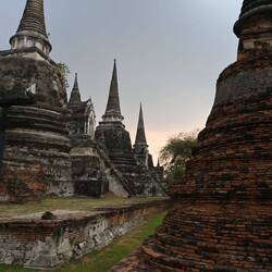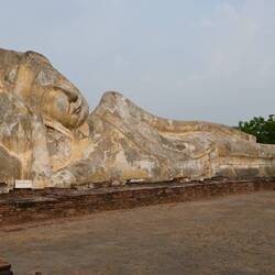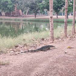 - Tamaras Erlebnisse: Mit dem Velo düste sie zuerst zu einem Tempel, mit einer eindrücklichen, noch gut erhaltenen Buddhagalerie. Die Anfahrt führte über eine Autobahnbrücke und die etwas schockierten Blicke der Auto- und Motorradfahrer liessen Tamara vermuten, dass dies wahrscheinlich nicht ganz legal war.😅 Um zum nächsten Tempel zu kommen, wählte sie deshalb einen Umweg durch das holländische und japanische Viertel. Wahnsinnig wie schnell die Autobahn von einer gut befahrenen Hauptstrasse, in eine ruhigere Quartierstrasse übergehen kann und man sich schon wenig später in einer ländlichen Umgebung auf Kieswegen befindet, wo die Menschen wieder freundlich Lächeln, winken und einem irgendwas hinterherrufen und der Weg immer wieder von Wasserbüffeln gekreuzt wird. Irgendwann wurde Tamara von ihrem Navi über solche Schleichwege gelotst, dass ihr schon nicht mehr ganz wohl war und als sie dann von einem Rudel wild bellender und zähnefletschender Hunde umkreist wurde und keine Hilfe in Sicht war, kam schon langsam die Panik. Aus Reflex reagierte sie wie in Krisensituationen in der Schule: möglichst ruhig irgendwelche bestimmte Anweisungen rufen und genügend Distanz aufbringen, um wieder einen klaren Kopf zu kriegen. Glücklicherweise erwischte der eine Hund nur Tamaras Hosen (zum Glück hatte sie sich heute trotz der Hitze für die Tempelbesuche für die langen entschieden) und so kam sie zwar mit wackligen Knie aber sicher beim nächsten Tempel an. Hier lag inmitten mehrerer Ruinen einfach ein riiieeesiiger Buddha herum. Der nächste Stopp entpuppte sich als der interessanteste. Nicht nur wegen den eindrücklichen historischen Überbleibsel, sondern mehr wegen den asiatischen Touristengruppen, welche sich in prachtvolle traditionelle thailändische Festkleidung geworfen hatten und nun munter Fotosessions machten. Irgendwann genug von dem touristischen Gewusel, machte sich Tamara wieder auf den Weg Richtung Unterkunft. Unterwegs traf sie nochmals auf einen riieesiigen liegenden Buddha, einen weiteren eindrücklichen Tempel und unzählige Komodowaranen, welche auf der Strasse die letzten Sonnenstrahlen genossen.