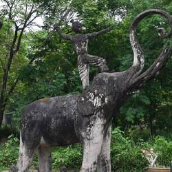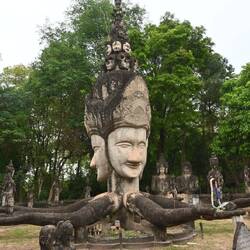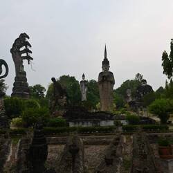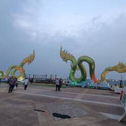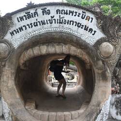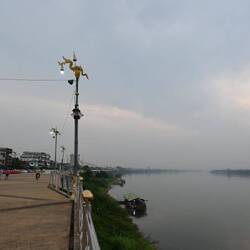 Am nächsten Tag hiess es wieder einmal ausschlafen. Juhui! Für die einen länger, für die anderen weniger. Während Sven friedlich vor sich hin döste, versuchte Tamara Frühstück zu finden. Gar nicht so einfach, da infolge Songkran vieles zu hatte und wir leider nicht auf Brötchen mit Leberchen oder Blutsuppe stehen. So wurde aus der Suche ein zweistündiger Spaziergang mit Inspektion aller Cafés, Garküchen und Supermärkten in der Umgebung. Als sie dann aber doch irgendwann mit einem akzeptablen Frühstück (schon mal was von croffel gehört, eine Kreuzung aus Croissant und Waffel?^^) zurückkam war auch Sven wach und es gab Frühstück im Bett. Erholter und entspannter als auch schon, leihten wir uns dann ein Velo und machten uns, Achtung ganz unerwartet!, auf zum Busbahnhof, wo wir uns erkundigen wollten wie wir am besten zu unserem morgigen Ziel, zu Wat Phu Tok, einem Tempel auf einem Berg und unserem Must-See schlechthin, kommen können. Wie schon in Kanchanaburi wurden wir plötzlich von einer sehr engagierten und hilfsbereiten Gruppe Uniformierter Beamten umschwärmt, wieder mit Fotoshooting und sogar gratis Wasser. So viel Aufmerksamkeit war uns schon etwas unangenehm. Im Gespräch wandelte sich unser Must-See, trotz mega Bemühungen unserer Hilfscrew ziemlich bald zu einem Can't-See, da zu umständlich zu erreichen. Etwas enttäuscht schwangen wir uns wieder auf unsere Drahtesel und machten uns auf zur ersten thailändisch-laotischen Freundschaftsbrücke. Unterwegs wurden wir sehr zur Freude der Einheimischen immer wieder mit Wasser beworfen und mit Farbe angemalt, welche hier oben im Vergleich zu Pak Chong, aber wie Waschmittel roch und weiss war. Farbig und klitschnass kamen wir dann im Zollbüro an, da wir dachten, wir könnten von da auf die Brücke. Falsch gedacht! Und auch mit der Idee auf der laotischen Seite ein Kaffee zu trinken, da Schweizer für 14 Tage gratis einreisen können, wurde nichts. Immer dieser Bürokram...😉 Zum Glück fanden wir aber ein Schlupfloch in Form eines Aussichtspunkt und so konnten wir immerhin unsere Arme über die Grenze halten. Nach dem Besuch der Brücke suchten wir wieder einmal erfolglos ein Café und wurden mehrfach geschminkt und getauft. Dieses Mal sogar von Mönchen und teilweise sogar mit EISwasser. Irgendwann gaben wir unsere Suche nach Koffein auf und tauschten es gegen Würstchen am Stiel von einem Foodmarket aus. Während dem Schlemmen beobachteten wir den Wahnsinn auf den Strassen: Die Thailänder fuhren den ganzen Tag mit ihren Pickups und bewaffnet mit Wasserpistolen und Eimern umher und lieferten sich so in voller Fahrt Wasserschlachten. Verkehrchaos pur! Mit unserem Velos kamen wir zum Glück ziemlich gut durch, wenn wir dadurch auch nicht wirklich verschont wurden. Trotz den beschriebenen Widerständen kamen wir an unserem nächsten surealen Ziel an. Ein Mönch, welcher in den 1970ern aus Laos flüchten musste, hatte hier in der Pampa einen Park mit hinduistischen und buddhistischen Skulpturen errichtet, Sala Kaeo Ku. Beeindruckend und gleichzeitig etwas gruselig, aber sehr beliebt bei asiatischen Touris (westliche gibt es hier auch nicht wirklich...). Noch interessanter als die Skulpturen fanden wir es aber, die riesen Welse mit Toastbrot zu füttern. Gemäss der buddhistischen Lehre sollte unser Karma nun etwas besser sein. Vielleicht klappt es nun ja wieder besser mit den Transportmitteln auf unserer weiteren Reise?😉 Als wir zurück radelten, landeten wir, nachdem wir im Mekong einmal mehr eine versunkene Pagode erhascht hatten für einen Apéro noch in einer süssen Bar und prompt auch auf dem Foto einer Googlebewertung der Gäste am Nachbarstisch. Zuhause warteten dann wieder einmal Haushaltspflichten: Wäsche waschen. So schlängelten wir uns mit unserer Dreckwäsche durch die langsam ziemlich betrunkenen, sich immer noch Wasserschlachten liefernden Jugendlichen zum Waschsalon. Die Wasch- und Trocknungszeit unserer Wäsche nutzten wir zum Visa beantragen und Alternativprogramm planen. Die saubere Wäsche schafften wir anschliessend sogar sauber und trocken in unsere Unterkunft, bevor es an der walking street Abendessen mit Livemusik gab, denn die Promenade am Fluss hatten sie zu Ehren Songkrans in ein riesen Festivalgelände verwandelt und das Konzert konnten wir sogar von unseren Betten aus noch mitverfolgen.