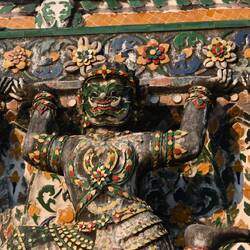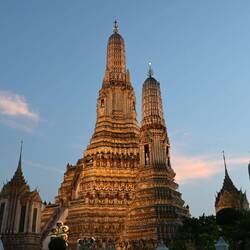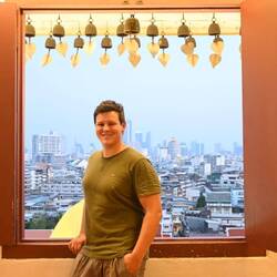Die Fahrt zog sich im brechend vollen Zug ewigs hin und wurde Stunde für Stunde mehr zu einer Bewährungsprobe. Tamaras Sitznachbarn vertrieben sich die Zeit mit Herumgrübeln an ihren Füssen und Ausleeren von Bier. Svens Begleitung war immerhin etwas charmanter und er bekam sogar ein Wasser geschenkt. Beide waren wir aber mehr als erleichtert, als wir endlich in Bangkok ankamen. Vom Zug gab es einen fliegenden (oder eher laufenden...) Wechsel in den Bus, der genauso klapprig war wie die auf dem Land. Nur dass hier noch extra Angestellte nur für den Ticketkauf mitfuhren. Dafür haben sie so Betty-Bossy-Frischhaltefolienschneider ähnliche Blechbüchsen, wo sie das Geld sammeln und die Tickets abklippsen. Sieht lustig aus, ist es auch.😅 Von der Busstation, wo wir wortwörtlich aus dem Bus auf die Srasse katapultiert wurden, ging es dann zu unserer Unterkunft, die idyllisch in einer Seitenstrasse an einem Kanal gelegen war. Allgemein gibt es viele Kanäle in Bangkok, was etwas an Amsterdam erinnerte. Sonst wurden wir noch nicht so schlau aus dieser Stadt. Irgendwie ist sie ein Schmelztiegel von allem: Touristen und Einheimischen, arm und reich, heruntergekommenen und fancy Ecken, Tradition und Moderne, Natur und Grossstadtvibe, Wasser und Land, laut und gemächlich... Auf jedenfall ganz anders als wir es uns vorgestellt hatten. In der Unterkunft angekommen, hüpften wie erstmal unter die Dusche, bevor wir mit der Express ferry auf dem Chao Phraya zu unserem Sonnenuntergang Spot "Wat Arun" cruisten. Die untergehende Sonne spiegelte sich in den zig-tausend Porzellansplittern, die als Mosaik den Hauptkomplex zierten. Echt bezaubernd, wären da nicht noch die im wegstehenden, verkleideten asiatischen Touristen gewesen, welche sich extra traditionelle Kleidung ausgeliehen und einen professionellen Fotograf gebucht hatten, um sich wirklich in JEDEM Ecken des Tempels abzulichten. Irgendwann wurden wir leider mit Trillerpfeifen aus dem Tempelkomplex geworfen. Da wir noch nicht so hungrig waren, wollten wir zuerst in einer der oft empfohlenen rooftop bars einen Apèro nehmen. Irgendwie fanden wir aber keine und so ging es doch gleich ins Restaurant. Nach dem Essen machten wir uns auf in die berühmt berüchtigte Khaosan Road. Als wir so durch die mit Lichtern in den Bäumen dekorierte Barstrasse durchschlenderten und den relaxenden Jazztönen lauschten, waren wir etwas überrascht... Das backpacker Mekka hatten wir uns völlig anders vorgestellt. Mehr als Partymeile mit feierndernden 16-jährigen Jugendlichen. Als wir dann in die nächste Strasse einbogen, befanden wir uns dann in der echten Khaosan Road.😅 Die meisten Bars hatten ihren eigenen DJ und ähnelten eher Clubs, alle 2m kriegte man Lachgas, gegrillte Insekten oder Reptilien angeboten und überall gab es die obligaten Thaihosen zu kaufen. Gar so schlimm wie vorgestellt, war es aber auch hier nicht. Eher amüsant und so setzten wir uns in ein Pub und beobachteten das Geschehen. Nachdem wir das Musikgewirr und angequatscht werden der Händler gesehen hatten, wechselten wir in eine ruhigere Bar. Zurück in der Unterkunft schneugten wir noch etwas von den Snacks, welche freundlicherweise immer bereitstanden und unterhielten uns noch mit einem französisch-irischen Pärchen.
