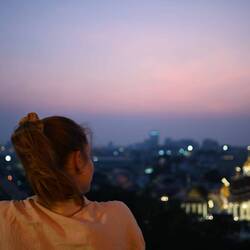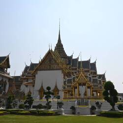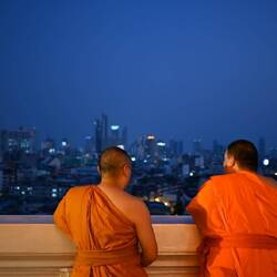 Am nächsten Tag machten wir uns auf Bangkok in 24h zu entdecken. Wie bei jeder guten Entdeckungstour starteten wir mit einem Frühstück und Kaffee. Da wir uns wieder in einer Stadt befanden, hatten wir für einmal auch wieder ungewohnte Auswahl. Nach dem Frühstück machten wir uns auf zum Souvenir shoppen. Aber nicht zu einem der touristischen Märkten oder hypermodernen shopping malls, nein, zu einem ziemlich versteckten und etwas verruchten Amulettmarkt. Thais sind ziemlich abergläublisch und kaufen deshalb allerlei Glücksbringer, also genau das richtige Souvenir für uns.😉 Da es viel zu bestaunen und ab und an auch zum schmunzeln gab, verging die Zeit wie im Flug. Nachdem wir die passenden Glücksbringer gefunden hatten, überlegten wir lange hin und her, ob wir wirklich DIE Sehenswürdigkeit Bangkoks, den königlichen Palast und den Smaragd Buddha anschauen gehen wollten. Pros: eindrückliche Architektur, historisch und kulturell interessant. Contras: teuer, viele Touris, zu heiss um verhüllt durch die riesen Anlage zu laufen. Schlussendlich entschieden wir uns dafür und unser Fazit, fällt 1 zu 1 wie eben erwähnt aus. Durchgeschwitzt retteten wir uns in ein modernes Museum mit Aircon, dass sich mit coolen methodisch vielfältigen Ansätzen ja sorry die Lehrerin drückt gerade durch😅) mit der Frage "Was macht Thaisein aus?" auseinandersetzt. Spoiler: Thainess ist nicht greifbar, als Thai kannst du alles sein, was du willst... Bevor wir den Rundgang starteten, blieben wir aber noch auf der lauschigen Picknickwiese vor dem Museum hängen, wo wir auf Picknickdecken faulenzten und einen kühlen Cappuccino sowie eine "Pizza" (eher ein Quiche mit ganz viel Mozzarella😋) genossen. Da wir recht verhockten, wurde es mit dem gemütlichen anschauen der Ausstellung dann etwas knapp und in den letzten Räumen wurden wir von der ganzen Belegschaft begleitet, welche gerne Feierabend machen wollte...😅 Genauso knapp düsten wir nach dem Museumsbesuch noch zu unserer letzten Sehenswürdigkeit und gleichzeitig Sonnenuntergangsstation dem Wat Saket. Dieser steht auf einem Berg, von welchem aus man eine 360° Aussicht auf Bangkok hat. Und wir wurden nicht enttäuscht. Auf dem "Gipfel" angekommen, sahen wir das Bangkok, wie wir es uns vorgestellt hatten mit einer Wolkenkratzer Skyline und uns wurde bewusst, wie wenig wir eigentlich gesehen hatten von dieser Stadt. Wir genossen die Aussicht wieder so lange bis wir freundlich von einem Mönch rausgeschmissen wurden. Da man in Bangkok einfach alles bekommt, machten wir uns ausnahmsweise auf zu einem Restaurant mit mexikanischem Essen (aka mexikanisch-asiatische Fusionsküche^^). Dieses lag im modernen Teil und so erlebten wir doch noch die überfüllten Strassen Bangkoks zu Füssen von Hochhäusern und hypermpdernen Shoppingmalls. Die letzten Meter legten wir zu Fuss durch einen Park zurück. Oder wohl eher durch das Fitnessstudio der Bangkoker. Dauernd kreuzten uns Jogger, an verschiedenen open air Fitnessgeräten schwitzten sich abmühende Locals und dazwischen wurde von grossen Frauengruppen Aerobic und Zumba gemacht. Nach einem gemütlichen Diner machten wir uns wieder auf zu unserer Unterkunft. Dieses Mal per Metro mit Tokenticket und Tuktuk, da der Bus spätabends noch unzuverlässiger fuhr als tagsüber. Angekommen hiess es erstmal Rucksäcke putzen, da diese mit ihrem blauen Outfit irgendwie nicht mehr so zufrieden waren und kurzerhand entschieden hatten, sich nun rot zu färben und so auch unsere Kleider... Naja die Ventilatoren im Zug waren wohl eher eine Dreckschleuder als eine Abkühlung... Als wir die geputzten Rucksäcke wieder schön ordentlich gepackt hatten und alles ready für den morgendlichen Flug war, hiess es dann endlich "Gute Nacht!".