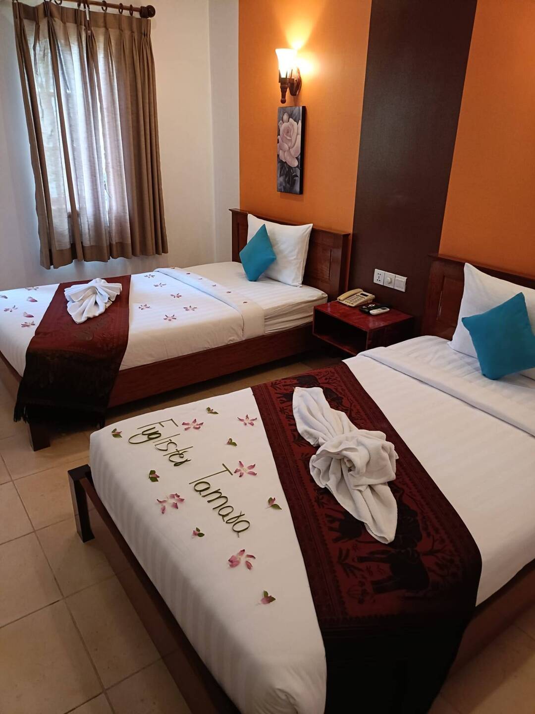 Nach einer kurzen Nacht, standen wir gemeinsam mit der cleaning lady im Morgengrauen auf, wodurch wir sie völlig aus dem Konzept brachten. Nachdem wir unsere sieben Sachen gepackt hatten und einen kleinen Snack genascht hatten, um etwaige Hungry-Attacken auszuschliessen, machten wir uns auf zur Busstation. Dort warteten wir dann sehr geduldig auf den richtigen Bus und schauten jedem falschen traurig hinterher. Irgendwann kam er dann doch und wir kamen überpünktlich am Flughafen an. Wie schon bei der Einreise klappte alles wie am Schnürchen und wir konnten in Ruhe noch unsere letzten Bahts für einen überteuerten Kaffee und Zmorgen verschleundern. Brav warteten wir anschliessend am entsprechenden Gate, aber das Flugzeug war bis zum Schluss nicht in Sicht und irgendwie flogen nur sehr wenige Passagiere mit uns. Kurz vor dem Abflug mussten wir trotz fehlendem Flugzeug boarden, in einen Bus. Dieser fuhr mit uns etliche Kilometer über das ganze Flughafengelände, bis wir schlussendlich bei unserem Flugzeug ankamen: eine kleine Propellermaschine, wie aus einem älteren Dokumentarfilm. Mit einem etwas mulmigen Gefühl stiegen wir ein und das Geschwanke beim Start beeinflusste dieses nicht unbedingt. Sobald wir in der Luft waren, fingen der Steward und die Stewardesse etwas gestresst mit dem verteilen des Mittagessens, denn der Flug dauerte gerade einmal knapp eine Stunde. So wahnsinnig Lust auf Essen hatten wir dank der Luftlöcher zwar nicht, aber gut erzogen wie wir sind, assen wir natürlich auf. Das Essen sahen wir dann beinahe ein zweites Mal, da die Landung mehr Hin- und Hergeschaukel einer Hängematte glich. Mit etwas flauem Magen überstanden wir denn Flug jedoch und standen das erste Mal auf kambodschanischen Boden. Die Passagiere unseres Fluges waren eigentlich die einzigen Ankömmlinge und so wurden wir von den Fahrern am Ausgang recht belagert und mussten etliche Male höflich erklären, dass wir bereits einen Transfer mit der kambodschanischen Post (ja die macht das in Kambodscha sogar) gebucht hätten. Nachdem wir uns eine SIM-Karte besorgt hatten und wieder online waren, wurden wir dann sogar recht schnell tatsächlich vom Pöstler abgeholt.😉 Bei der Post wurden wir dann auch schon von unserem vom Hotel organisierten Tuktukfahrer begrüsst, der sich eifrig unser Gepäck schnappte. Dachten wir zumindest, denn wie sich herausstellte, war das gar nicht unser Fahrer und so war unser Transfer schlussendlich auch nicht mehr "for free". Im Hotel wurden wir wie Könige mit Erfrischungstücher und hausgemachten Ice Tea empfangen und das Personal trug uns sogar unsere Rucksäcke ins vorgekühlte Zimmer, welches wunderschön mit Blumen und Namen verziert war. Wow! Sobald wir uns etwas anklimatisiert hatten, machten wir uns sogleich an die Planung eines unserer Südostasien-Highlights: Angkor Wat. Eigentlich war es ziemlich einfach, denn wir mussten dafür nur an die Rezeption, die alles für uns organisierte. So hatten wir plötzlich unerwartet Zeit und zufälligerweise war an der Hotelbar gerade Happy Hour. Das war wohl ein Zeichen... Nach Sir Collin, Mai Tai und Long Island spazierten wir zu einem versteckten kambodschanischen Restaurant, wo wir das zweite Mal an diesem Tag wie Könige behandelt wurden. Das Essen war trotz deutlich milderer Würze als in Thailand sehr lecker und Sven entdeckte seinen Khmer Favoriten: Lok Lak. Ein toller Nebeneffekt war, dass wir mit diesem kulinarischen Erlebnis auch gleich verschiedene Hilfsprojekte unterstützten. Anschliessend schlenderten wir zu einem 7 Eleven, wo wir uns mit dem Wichtigsten eindeckten. Zurück ging es mit der Tuktukmafia. Dieses Mal waren wir aber auf die Preisverhandlung vorbereitet.