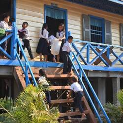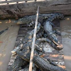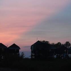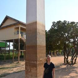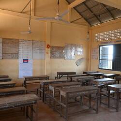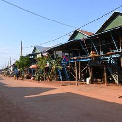 An unserem letzten Tag in Siem Reap konnten wir endlich wieder einmal etwas ausschlafen und reizten die Checkout-Zeit bis 11 Uhr voll aus. Nachdem wir unserer Lieblingsbeschäftigung nachgegangen waren, unsere sieben Sachen packen, gingen wir wirklich zu einer unserer Lieblingsbeschäftigung über, Kaffee trinken und brunchen. Danach ging es zurück ins Hotel, wo wir darauf warteten zu unserer Tour zu Kampong Phluk, eine der floating villages, abgeholt zu werden. Und einmal mehr fühlten wir uns extrem wichtig, als ein luxuriöser Minivan einfuhr und ein freundlicher Guide uns mit unserem Namen ansprach. Obwohl es eine geteilte Tour war, befand sich neben uns nur eine weitere Person im Bus, Amy aus Manchester. Ry unser Tourguide liess auch ziemlich schnell durchblicken, dass ein Ausflug zu den floating villages im Moment nicht so lohnenswert sei, da diese infolge der Hitze natürlich nicht geflutet waren. Als Trösterli baute er dafür aber spontan einen zusätzlichen Stopp bei einem Kunsthandwerkszentrum ein, wo wir Einblick in die verschiedenen Fachrichtungen des Khmer Handwerkes bekamen. Es war erstaunlich zu sehen, was die Handwerker/innen aus Seide, Holz, Leder, Ton und Stein zauberten. Danach ging es aus Siem Reap raus, auf staubigen Strassen immer mehr aufs Land (ja genau der Sand, der bereits unsere Kleider neu eingefärbt hatte), wo riesige Felder, Kühe und kleine Farmen wieder mehr die Landschaft dominierten, bis wir zu den ersten Stelzenhäusern des Fischerdorfes Kampong Phluk kamen, die sich entlang eines ausgetrockneten Seitenarmes eines Flusses schlängelten. Ry zeigte uns mittels Fotos immer wieder, wie es während der Regenzeit hier aussehen würde. Bis zu 9m kann die Differenz der Wassertiefe von der Trockenzeit zur Regenzeit variieren und der Tonle Sap (der See an welchem die floating villages liegen und auch der grösste Süsswassersee Südostasiens) erweitert seine Grösse bis auf das 5-6fache. Da in dem Dorf heute gerade ein buddhistischer Feiertag war, konnten wir zu Tamaras Freude in eine High School gügseln. Sehr eindrücklich zu sehen, dass es in den Schulräumen, wie bei uns vor 100 Jahren aussah und Ry stolz erklärte, dass sie nun sogar Tafeln hätten und sie nicht mehr auf Ton schreiben müssten... Nachdem wir etwas unter den Pfahlbauten Häusern hindurchspaziert waren, einen bunten Chrüsimüsi-Hindu-Buddhistischen Tempel (Kambodschaner seien nur Fake Buddhies erklärte uns Ry) angeschaut und Frauen abgewimmelt hatten, die Spenden für Schulmaterial wollten (welches schlussendlich leider für alles andere, aber nicht für Bildung gebraucht wird), wechselten wir auf unser (seit Khao Sok) Lieblingstransportmittel, auf ein Longtail Boot aka wackelige Nussschale. Damit kämpften wir uns im seichten, dreckigen Wasser vorbei an unzähligen brachliegenden Touristenbooten und durch einen Mangrovenwald zum See. Auf dem See angekommen tuckerten wir zu einem Café, unserer Sonnenuntergangslocation. Dort führte uns Ry zuerst zu einem improvisierten Swimmingpool. Darin zu baden wäre aber gar keine gute Idee gewesen, da hier die Nutztiere der Familie, welche das Café unterhielt, untergebracht waren: Krokodile. Natürlich konnte man vor Ort auch gleich Produkte aus Krokodilleder erwerben. Interessanter als die Krokodile, welche uns ziemlich leid taten, fanden wir wie die lokale Bevölkerung das dreckige Wasser des Sees aufbereitete. Sie verwenden dafür einen grossen Klumpen Aluminumsulfat, den sie 10 Sekunden durchs Wasser schwingen und wodurch sich der Dreck dann am Boden absetzt. Mit Kokosnuss und Bier (ohne Ei - Ry erzählte uns, dass er das Stout gerne mit bis zu 10 rohen Eiern trinkt) genossen wir den Sonnenuntergang bevor wir dann mit dem Boot zurück zu unserem Van tuckerten, welcher uns wieder zum Hotel brachte.
