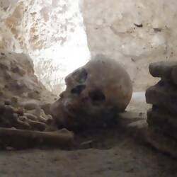 Hier sind die wenigen Knochen und der eine Totenschädel hinter Glas.