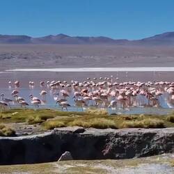 Premier réveil au milieu du Sud Lipez dans notre petit village du désert. On a accepté un changement proposé par notre guide Luis, on se réveille donc assez tôt pour partir directement à la Laguna Colorada. Après une heure de 4×4 nous voilà devant cette grande laguna de couleur rouge. Elle est entourée de montagnes enneigées et des milliers de flamants roses y gambadent gaiemment. On est en saison de migration il y en a donc moins que d'habitude (genre 3 000 au lieu de 20 000) mais ils sont quand même assez nombreux pour nous casser les oreilles (car oui ça fait un bruit d'enfer). Après une explication de Luis sur les trois types de flamants roses que l'on peut trouver (notre mission sera de reconnaitre les trois espèces) dans la lagune, on se lance dans une balade de 1h pour la découvrir. Tout est magnifique, les flamants, la couleur de la lagune, les montagne, le reflet de l'eau ......