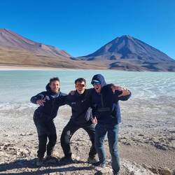 Après la pause déjeuner, c'est direction le désert de Dali une grande entendu de sable bloquée entre les montagnes et parfaite pour faire des figures sans se faire mal. Une fois les pirouettes de Joseph terminées, on se rend à laguna blanca puis la laguna verde. La dernière se situe au pied d'un volcan culminant à plus de 6000m. Sa couleur est due à l'arsenic qu'il contient. Il devient vert lorsque le vent se lève et que les différents minéraux se mélangent. Le guide nous lâche au bord du lac et on s'amuse comme des enfants au bord avant de réfléchir et de se dire que jouer dans la boue au bord d'un lac d'arsenic c'est peut être pas bon du tout ..... (ne vous inquiétez pas on est toujours en vie)