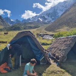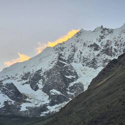 On redescend ensuite au campement. De là, les filles, qui étaient descendus avant, nous font un spectacle pour fêter nos 1 mois de voyage ensemble. C'est très amusant, très esthétique et réalisé avec beaucoup de grâce. S'en suit d'autres activités folles de mimes, chorales et autres fantaisies avec en toile de fond, derrière nous la montagne Humantay et son pic à plus de 5500 mètres, qui s'habille aux couleurs du couché de soleil. C'est beau et ce moment permet de rigoler et de nous réchauffer car la nuit s'annonce, et le froid aussi.