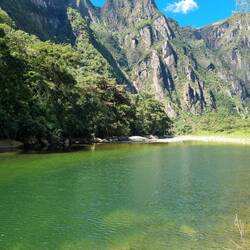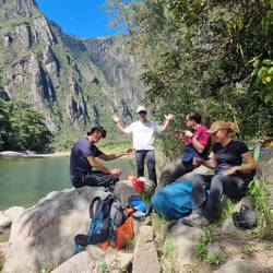 Après 3 bon kms de marche, on trouve un spot à côté du chemin, au bord de la rivière d'où l'on peut apercevoir quelques ruines du Machu Picchu, pour manger.