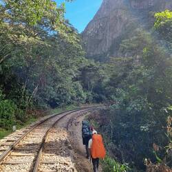 Après avoir acheté quelques fruits pour le repas du midi, on se met en route pour notre destination finale en longeant la mythique voie du chemin de fer qui fait le tour de la montagne Machu Picchu.