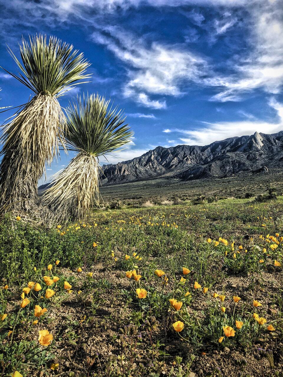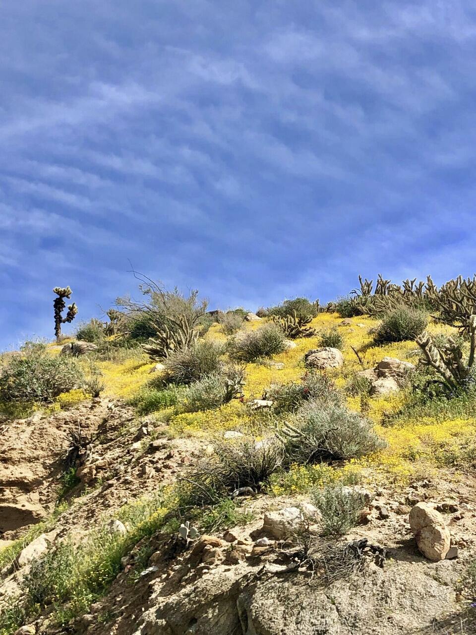 In Spektrum der Wissenschaft lass ich vor dem Urlaub, dass es dieses Jahr im südlichen Kalifornien eine super wild flower geben soll, weil es im Winter viel geregnet hat. Auf dem Hinweg führen wir in den südlichen Teil und übernachten in Aqua Caliente, aber da waren die flowers nicht so weit verbreitet. Man erzählte mir, dass man eher in den nördlichen Teil dieses riesigen State Parks muss üm ganze Teppiche von wild flowers zu sehen. Diese sahen wir nicht aber doch einige aber nur an bestimmten Stellen. Hier gab es auch die Raupen, die die Hauks anziehen.