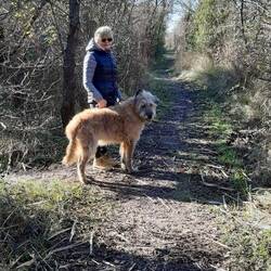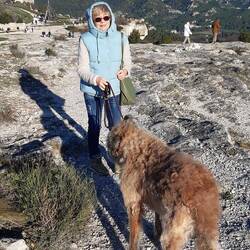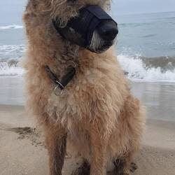 Ausgeschlafen, Bäckerei leergekauft, Frühstück und dann ab ans Meer. Fitou trägt seine Sandkolikpräventionsausrüstung.