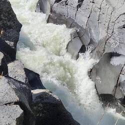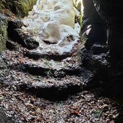An der offiziellen Stelle war angeblich wegen dem Hochwasser die Treppe in die Schlucht gesperrt .