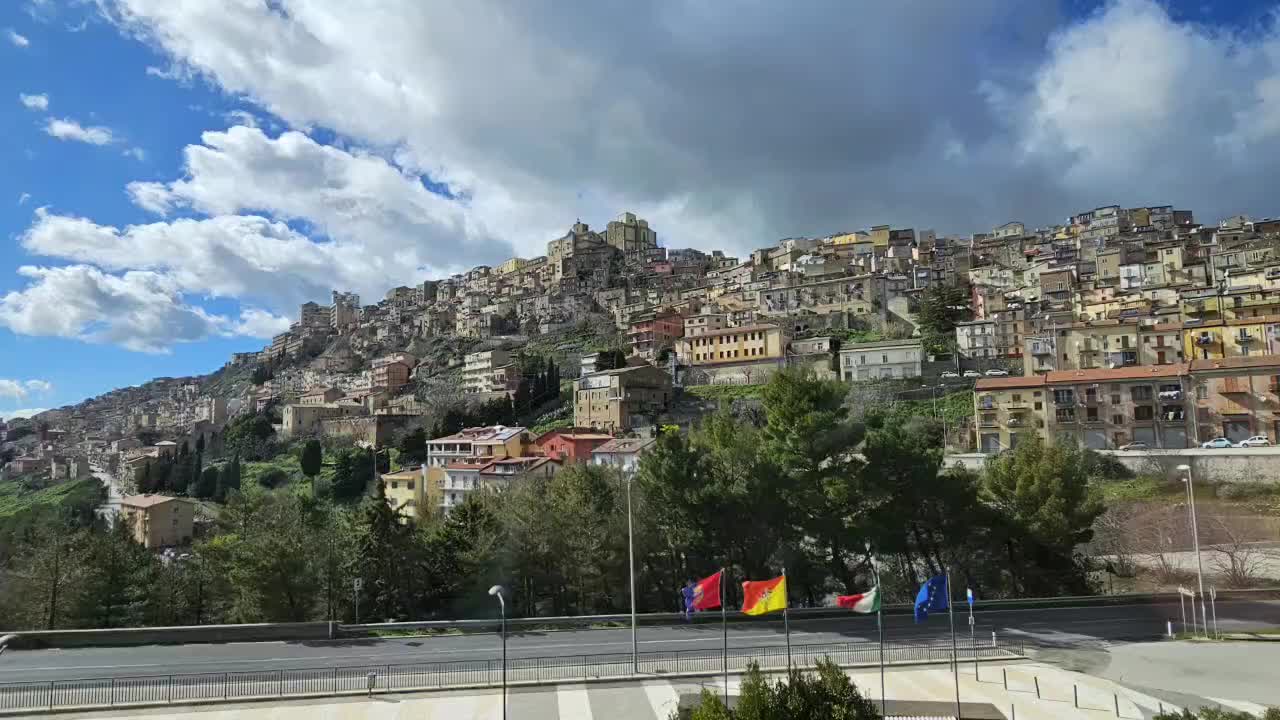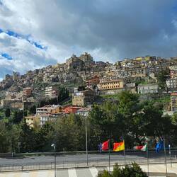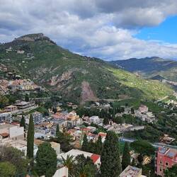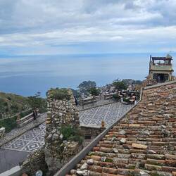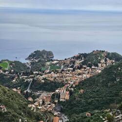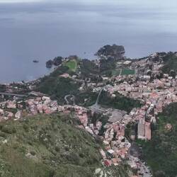 liegt am Hügel und die Stadtteile werden mit einer Seilbahn🚠 verbunden. Wir haben den steilen Berg mit unserer Skymax🛵 bezwungen und sind bis zum Castelmola hoch und haben dort die DrohneLäs mer