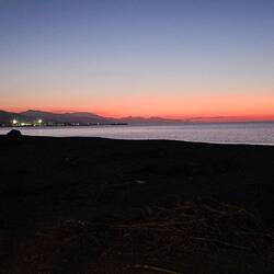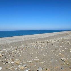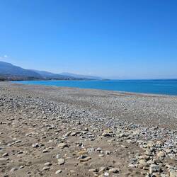 Einen langen Strand mit Kieselsteinen und Sand.