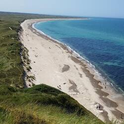 Schöner Küstenstreifen eingebettet in Dünen und einem Leuchtturm am Ende.