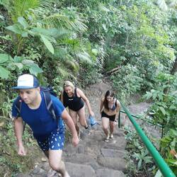 Die Busfahrt am Morgen, nach nur 2.5 Stunden Schlaf war eine Zumutung! Zum Glück kenne ich das Gefühl eines Katers nicht, also ich leide echt nie an Kopfweh oder Übelkeit, aber der Bus und der Fahrer gingen gar nicht. Die Sitze endeten knapp unter der Schulter, also bequem sitzen oder Kopf anlehnen konnte man vergessen. Immerhin war es temperatur-technisch kein Eisfach. Der Fahrer wollte glaub schnell Feierabend haben und so rasten wir über die holprigen Strassen. Mit 10 Minuten Pause verbrachten wir etwa 3 Stunden im Bus und ich war echt froh, als es vorbei war. Am Busbahnhof organisierten wir uns ein Tricycle zu unserer Unterkunft. In der Buchungsbestätigung stand schon etwas von einem speziellen Hostel-Shuttle ab McDonalds. Ich war verwirrt. Der Tricyle-Fahrer schmiess uns beim McDonalds raus. Lustigerweise kam genau in dem Moment so ein altes klappriges Moped mit kleiner Ladefläche vorgefahren, welches mit dem Namen unseres Hostels angeschrieben war. Ich sprach ihn an, und er nickte freundlich, wir sollen einsteigen. Er versorgte unser Gepäck und zeigte uns an, dass wir ganz nach hinten auf die Sitze sitzen sollten, direkt hinter ihn. Mir ahnte Böses, vermutlich ging es gleich richtig berghoch. Und ohne Witz: Ich konnte nicht mal mein Handy rausholen um den Berg festzuhalten. Ich hatte echt Schiss, dass wir mit dem Gefährt umkippen! Mit ca. 5km/h tuckerten wir bergauf, der Fahrer beugte sich weit nach vorne, wir taten es ihm gleich. Ich war echt richtig froh, als wir oben ankamen! Da wäre ich mit meinem Gepäck wirklich niemals hochgekommen!