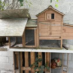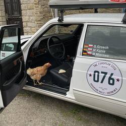 Übernachten in einem Dorf in Frankreich. Tagesaufgabe: Ein Huhn fährt unser Rallyecar. Erledigt!
