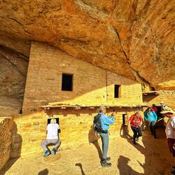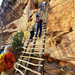We learned about the history of the indigenous people who initially settled on the top of the Mesa and stayed there for approximately 700 years until a “mega drought” forced them to the seep springs that naturally formed in the cliffs below. The families that built these dwellings still continued their way of life including forming dance floors and kivas for ceremonies. We really enjoyed the tour including the ladders the park has placed to climb to the dwellings and the tunnel you had to crawl through to exit (there’s a picture of Thomas, our guide, holding a blue frame at the beginning of our tour to show the size of the tunnel).