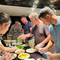 We took a street food tour and what a delight it was! We tried some delicious pho, and lots of rice flour concoctions! We also sat outside on these small chairs in the midst of street chaos.Leia mais