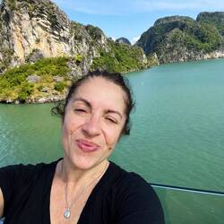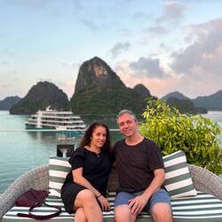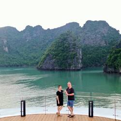 In the morning we got picked up by a comfortable van and drove 2.5 hrs to Halong Bay. We got our first glimpse of stunning emerald green karst hills in the azure ocean, and the picture was as stunningLeia mais