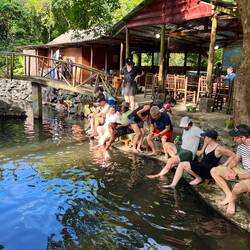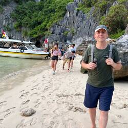 We took a morning tour by the local row boat of the Bright Cave - which was really a passage though the cave like tunnel with stalactites, into the bright blue lagoon within the karst formations. AndLeia mais