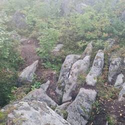 Die Treppe war steil und die Stufen unterschiedlich hoch, sodass man konzentriert bleiben musste. Trotzdem war es eine leichte Erholung von den unebenen Pfaden. Am Fuße der Treppe Erreichte ich wieder jenes Schild, bei dem ich mich zuvor für Hang und Steine entschieden hatte. Ich machte mich also auf in die Richtung, aus der ich von unten gekommen war. Nach kurzem teilte sich aber der Weg und es gab 2 Strecken mit blau-weißen Markierungen. Aufgrund meiner etwas alternativen Rute hoch, wusste ich nicht, wie die eigentliche Weg nach unten aussehen musste; natürlich entschied ich mich also für den falschen (rechts) Weg. Das merkte ich aber leider viel zu spät, denn die Natur um mich herum war spannend und der Wege sehr aufregend. Außerdem ging es bergab also, alles richtig....