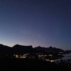 Es war nun also dunkel, hinter den Bergen erneut das Leuchten und am Himmel die Sterne. Ich hielt das Feuer in gang, während die beiden sich umsahen. Bei einem kurzen Blick nach den beiden, bemerkte ich wie Mark auf den Himmel hinter mir deutete und versuchte Michel etwas zu zeigen. Mein Blick folgte seinem Finger und endete da, wo etwas was ich zunächst für eine Wolke hielt, anfing. Michel hatte es immer noch nicht erspäht, aber ich begriff nun was Mark meinte: "Aurora" sagte ich freudig erstaunt in die Runde. Schwach, aber das Handy gab Mark recht. Im Verlauf des Abends und der Nacht, nahm das Spektakel zu. Es überzog den ganzen Himmel, änderte seine Form und faszinierte uns alle gleichermaßen. Immer mal wieder kam ein slovakischer Ausruf des einen, dann wieder des anderen, wenn einer wieder ein besonders schönes Leuchten erspäht hatte. Ich widmete mich abwechselnd dem fotografieren und dem Feuer bzw. meinem darauf garenden Essen; es gab Ravioli, heute mit Fleisch.