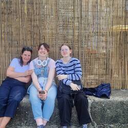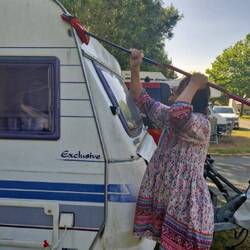 Morgens hat es geregnet, deshalb haben wir endlich unser Sonnendach aufgebaut, damit wir wenigstens draußen sitzen können. Da wir im Bus auch einen Tisch ausklappen können, haben wir uns totalBaca lagi