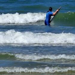Auf der Suche nach den Wellen sind wir zum Grand village Plage gefahren. Es war gar nicht so voll wie wir befürchtet hatten. Ziemlich stürmisch, aber immer noch keine richtig guten Wellen, trotzdemBaca lagi