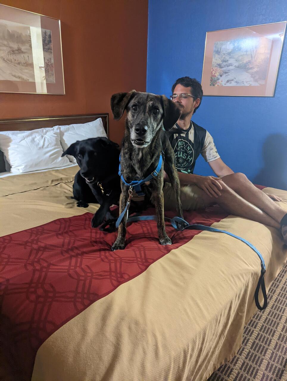 Hard to get a good picture of the dogs when they're all worked up exploring their new "home" at the Knights Inn
