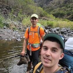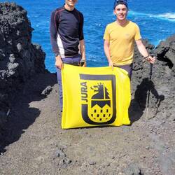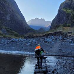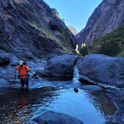 Descente sur la rivière des galets, où il y a eu une belle chute du Jim dans la rivière.