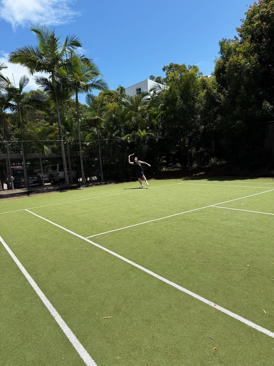Heute gab es tolle Neuigkeiten: Wir konnten endlich in die Unterkunft wechseln, die wir ursprünglich gebucht hatten 🏠✨. Kaum angekommen, ging es auch direkt auf den Tennisplatz 🎾. Die Vorbereitungen für die Australian Open laufen bei uns auf Hochtouren! 🇦🇺 Allerdings waren wir nach gut 20 Minuten intensivem Spiel bereits klatschnass geschwitzt 💦.