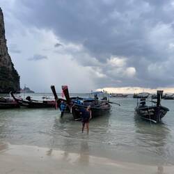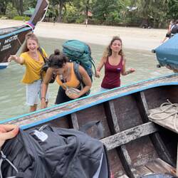 עלינו למעבורת שהיא בעצם מטוס ששט על המים, השיט היה ממש יפה כל מיני סלעי ענק מסביב והנסיעה עברה מהר. מתי שהוא באמצע הנסיעה אופיר פתאום אמרה לנו שהיא לא בטוחה איפה ואיך בדיוק יורידו אותנו בריילי כי אמרו שמגיעים לחוף המערבי, ואופיר שהייתה שם כבר יודעת שבחוף המערבי אין מזח ולא ברור איך הסירה תגיע להוריד אותנו עד החוף. תהינו לעצמנו מה יקרה והחלטנו לסמוך על התאילנדים הם אמרו בסוכנות שזה מעבורת אחת מקופיפי עד לריילי.