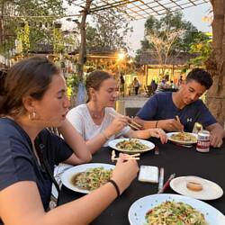תיי הנהג תוק תוק שלנו אסף אותנו משם ליום של הסתובבות בפרברי סיאם ריפ התכנון היה ללכת לטבילה באגם הגדול טונלה סאפ (בקמרית-האגם הכביר) ולכפרים מקומיים לא תיירותיים. בפועל הנהג לא ידע כל כך לאן נוסעים, הבנו שבעונה היבשה אי אפשר לטבול באגם וההתכתבויות של שוהם עם שלום הישראלי המקומי שנמצא פה לא כל כך הניבו פרי אז פשוט ביקשנו מהנהג שיזרוק אותנו באיזה נקודה אקראית בכפר והתחלנו ללכת ברגל. כל הכפר זה מן פרפר עני של סיאם ריפ, הם גרים שם בבתי עץ ופחונים שכולם מוגבהים מעל האדמה כי בעונה הגשומה הכל מוצף והמים מגיעים כמעט עד רצפת הבתים. לא עברו כמה דקות ואיזה מקומי קרא לנו לשבת עם החברים שלו אצלו בבית על בירה (אכן 11 בבוקר זה שעה לגיטימית לבירה). ישבנו איתם קצת ושברנו שיניים כדי לנסות לתקשר איתם באנגלית אבל היה מאוד נחמד וגם איתם עשינו מלא צ׳ירמוי.