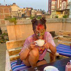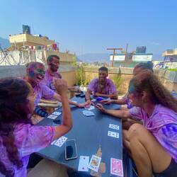 קמנו ב9 קצת מוקדם יחסית כדי להספיק להגיע לסוכנות של שלום לפני תחילת החגיגות. השארנו בחדר את כל היקר לנו כולל טלפון כסף והכל, דחפנו כל אחת לחזיה את המפתח ו1,000 רופי, ויצאנו לכיוון החדר של דן הגר רועי וירדן. נמשכנו שם כולנו בשמן קוקוס בשיער כדי שהצבעים יצליחו לרדת מאיתנו בסוף היום ויצאנו ביחד כל החבורה העליזה לסוכנות של שלום. היינו בין הישראלים הראשונים שהגיעו כי הקדמנו את השעה שדּב אמר לכולם לבוא, לקחנו לנו בחינם חולצות לבנות וכולם גם שילמו על הטרק חוץ מעלמה של וממני שביקשנו משלום הארכת זמן למחר בבוקר כדי להחליט סופית מתי אנחנו יוצאות לטרק. נצבענו קצת במשרד וירדנו לעשות כולנו לחיים ולהתחיל את החגיגות.